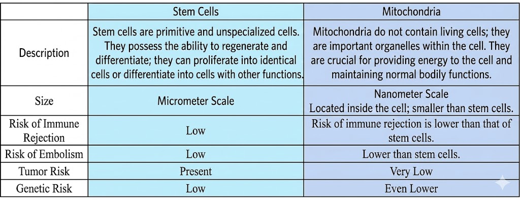 “Mitochondrial regeneration therapy” is a regenerative medicine technology that has received much attention and focus in recent years, marking a new milestone in the application of mitochondrial medicine. Many cutting-edge medical teams have discovered that directly delivering healthy mitochondria to damaged areas, including the heart, brain, and lungs, allows damaged cells to acquire healthy mitochondria, improving damaged tissue and restoring organ function. This can also be considered cell-free therapy; compared to stem cells, mitochondria are much smaller, at the nanometer scale, and carry a lower risk of genetic mutations, vascular embolism, immune rejection, and tumor formation.