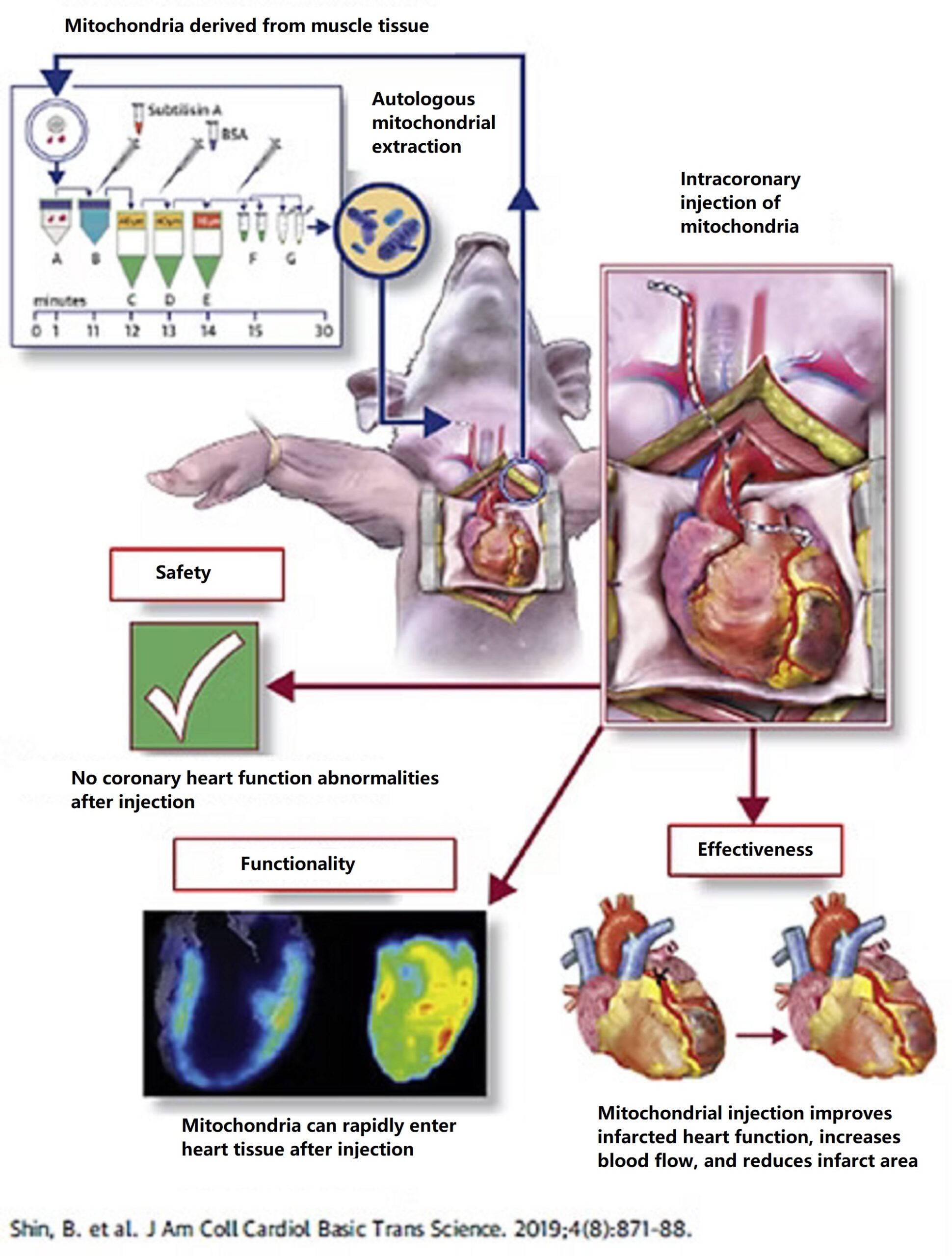 When the heart is blocked by blood vessels, blood cannot be transported to the heart tissue, causing myocardial deprivation of oxygen and nutrients. This damage to mitochondria quickly leads to myocardial death. Studies have shown that directly extracting mitochondria from muscle tissue and then injecting them into ischemic myocardium (“mitochondrial reconstruction therapy”) resulted in increased mitochondrial activity and inhibited myocardial cell death in animals receiving this therapy. This effectively improved cardiac contraction and relaxation functions, and the therapy was also safe. In clinical trials, “mitochondrial reconstruction therapy” has also been shown to improve cardiac function in children after myocardial infarction and revascularization.