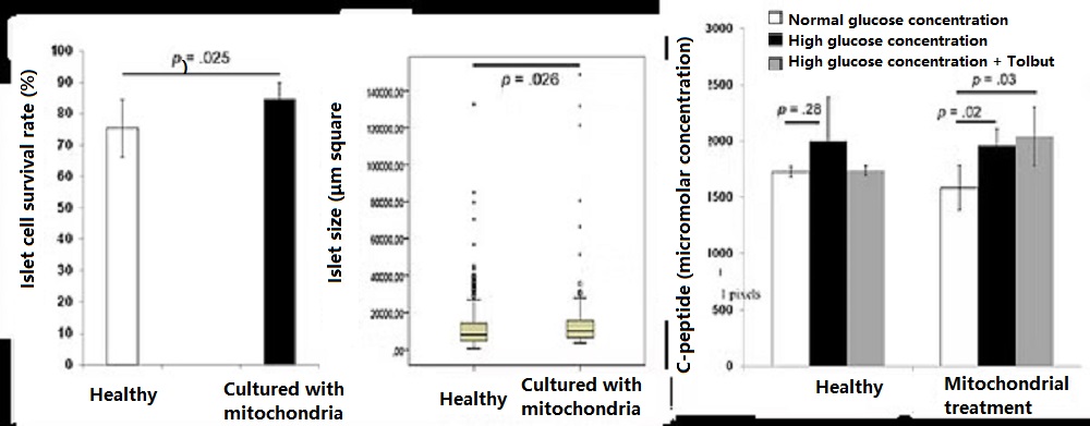 Diabetes has become a global health problem. Type 1 diabetes is a hereditary disease caused by the body’s own immune cells attacking pancreatic tissue, leading to pancreatic cell death. Type 2 diabetes is primarily caused by a high-sugar, high-fat diet, which weakens mitochondria and reduces their function, resulting in significantly increased oxidative stress. Prolonged high blood sugar gradually leads to pancreatic cell death and an inability to produce insulin. Both type 1 and severe type 2 diabetes patients suffer from impaired or dead pancreatic function, preventing insulin production. Preclinical studies have shown that culturing the pancreas and mitochondria together can enhance islet activity and increase insulin release. In the future, “mitochondrial reconstruction therapy” may be clinically applied to treat diabetes, including type 1 and type 2 diabetes, to increase the survival rate of islet cells and insulin secretion.