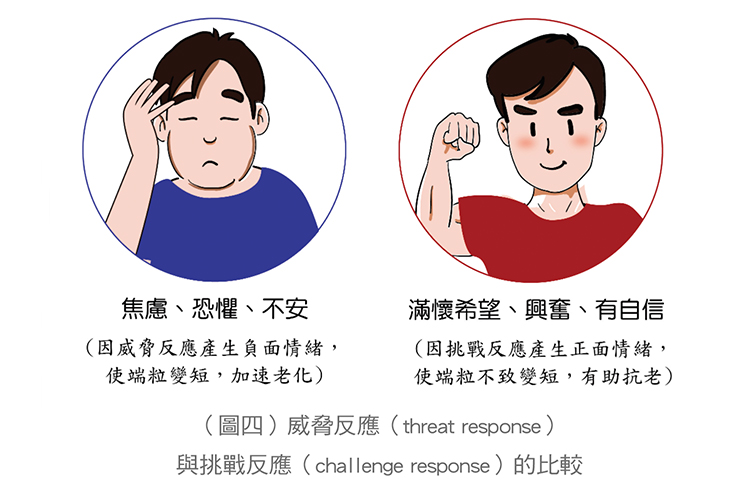 如果承受壓力過大或過長,則變成威脅反應(Threat response),此時反而造成焦慮、恐懼,導致血管收縮,流向腦部血液變少,迷走神經活動變少,腎上腺分泌皮質醇,使血糖上升,反而不利於端粒的健康,使細胞趨向衰老。所以在人的一生當中,如何化阻力為助力,使挑戰反應取代威脅反應變成優勢,不要使端粒的健康受到傷害,相對免疫細胞會強化,不好的發炎反應會減少。根據Dr.Kross、Dr.Ayduk及Dr.Elissa Epel等人研究證實,如果處於高度壓力情況下,能夠隔離思考與情感,利用正念減壓、冥想、瑜伽、太極拳或氣功等方式,可使壓力變成正向,反而有益。