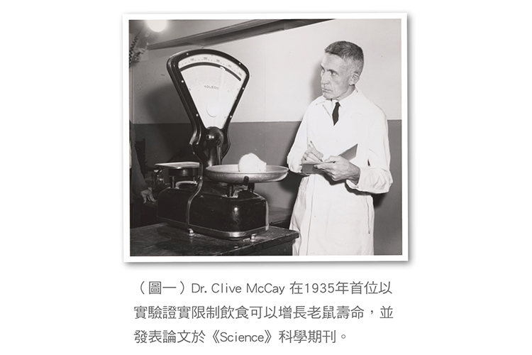 關於長壽飲食,遠自古希臘蘇格拉底時代,當時的醫師就建議限制飲食,但無實證醫學的支持,乃至1935年康乃爾大學教授克萊夫·麥凱(Clive McCay)證明小鼠限制飲食熱量20%,比起正常飲食的控制組,壽命明顯增長,並發表於《科學期刊》(Science)(圖一),接下來長達80年的研究一再證實,在無營養不良情況下的熱量限制法(Calorie restriction,CR)有益於延長壽命,包括酵母菌、果蠅及齧齒類動物均有同樣報告。