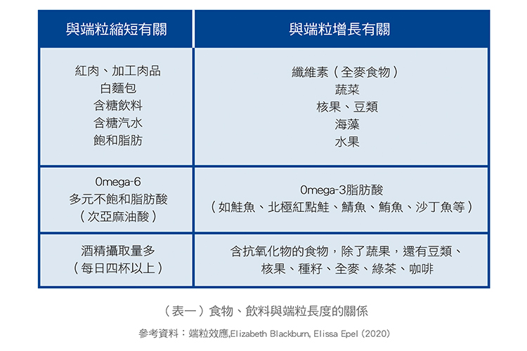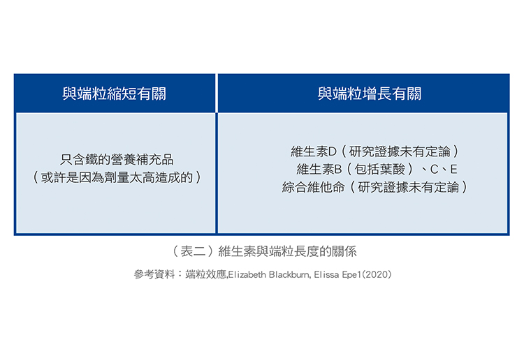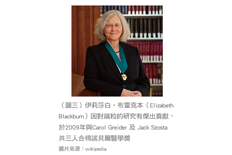 另外,美國研究老化的大師Dr.Sinclair也同意限制熱量是增進長壽的好方法,由於伊莉莎白.布雷克本等三人發現端粒與壽命有關,而且長壽的人其端粒長度都比短命的人較長,細胞也不易衰老,此項重大發現,非常重要,因而在2009年獲得諾貝爾醫學獎(圖三),而後很多人爭相探討哪些食物與營養素可以增加端粒的長度,到目前根據諸多學術研究,有比較一致的看法,如下列(表一)及(表二)所示,供讀者參考。