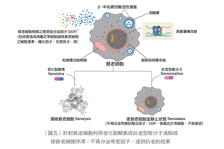 清除衰老細胞是對抗老化的新策略,可透過藥物,即所謂衰老細胞裂解素或衰老細胞溶解藥物(Senolytic drug),它可專一性誘導衰老細胞產生凋亡(apoptosis)。另一種方法是可使用藥物或天然植物之萃取物使衰老細胞產生的分泌因子(所謂衰老細胞有關表現型分泌因子,senescence associated secretory phenotype,SASP)減少或降低至零,使其不再影響週邊正常細胞變成衰老細胞,此種方法叫抑制老化或衰老停滯(Senostasis),也就是所謂抗老型態分子(Senomorphics)。