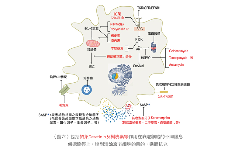 迄今為止,細胞衰老在細胞內有不同的訊息傳遞路徑,例如:(1)抗凋亡途徑(BCL家族)、(2)抗PI3K及相關激酶途徑、(3)抗P53途徑、(4)抗NF-κB途徑、(5)抗mTOR途徑、(6)抗JAK-STAT途徑。這些訊息傳遞路徑都有對應的藥物及相關人體臨床試驗,這些抗老藥物,統稱「老化裂解素」(Senolytic),這些小分子藥物專設用來殺死衰老細胞,誘發原本應該發生的死亡程式。