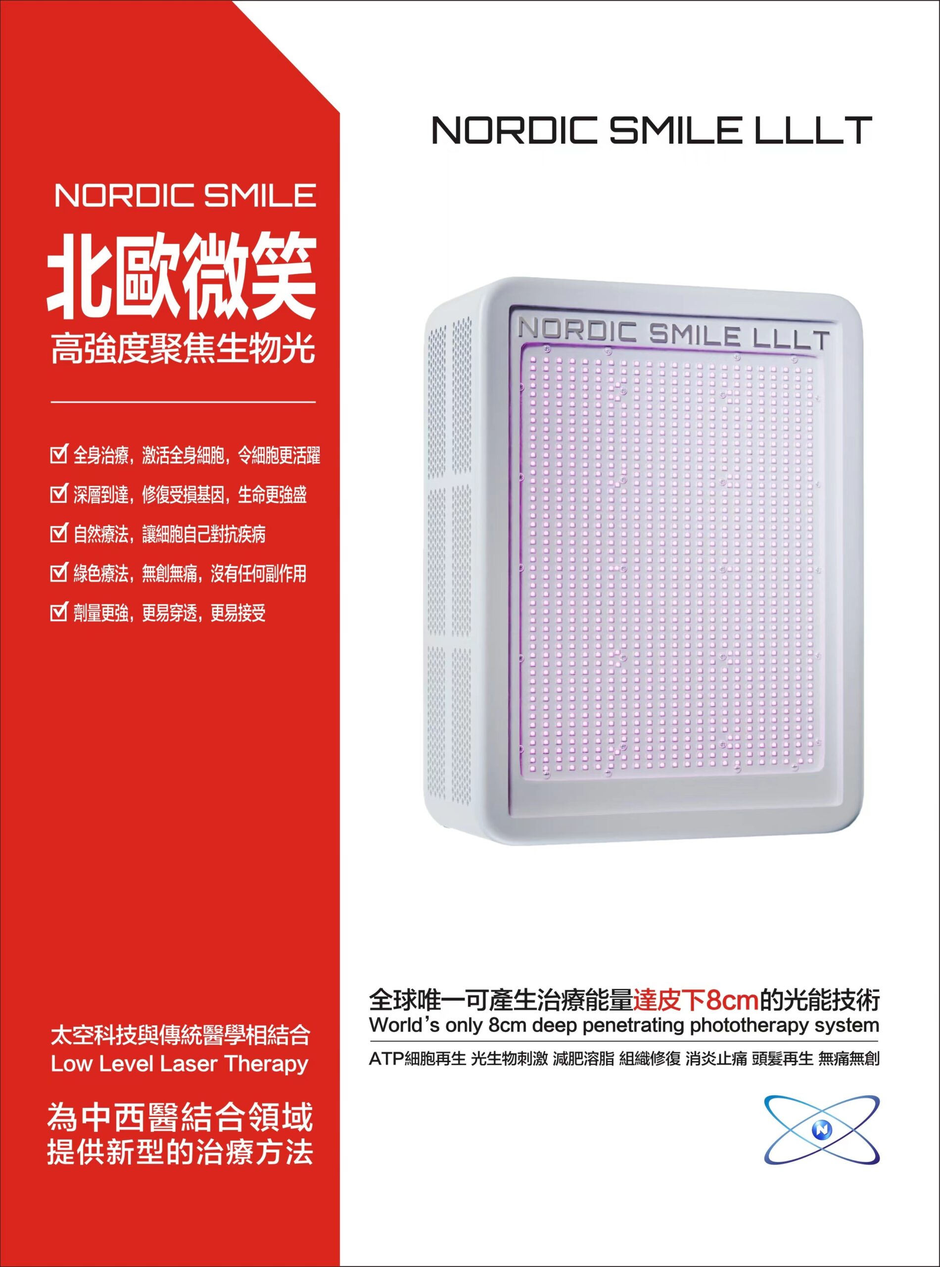 量子光Low Level Laser Therapy (LLLT) ,亦稱激光針灸(Laser Acupuncture),是一種革命性的治療方法。原理是利用量子光直接照射人體深層來刺激自我修復,以達到細胞平衡。NORDIC SMILE LLLT 量子光治療儀能發射單一波段的量子光,其穿透能力可達皮下8cm,通過光量子的生物效應,產生深層作用於人體微血管、淋巴組織、神經末梢、經絡系統等部位,並與人體細胞產生光生物刺激作用(Bio-stimulation),最終增強人體ATP細胞能量、激活人體自身幹細胞及細胞因子分泌,促進細胞的增生和抗氧化能力、增強細胞的新陳代謝和抗凋亡能力、可有效清除體內自由基、增強血液攜氧能力,從而徹底改善微循環。